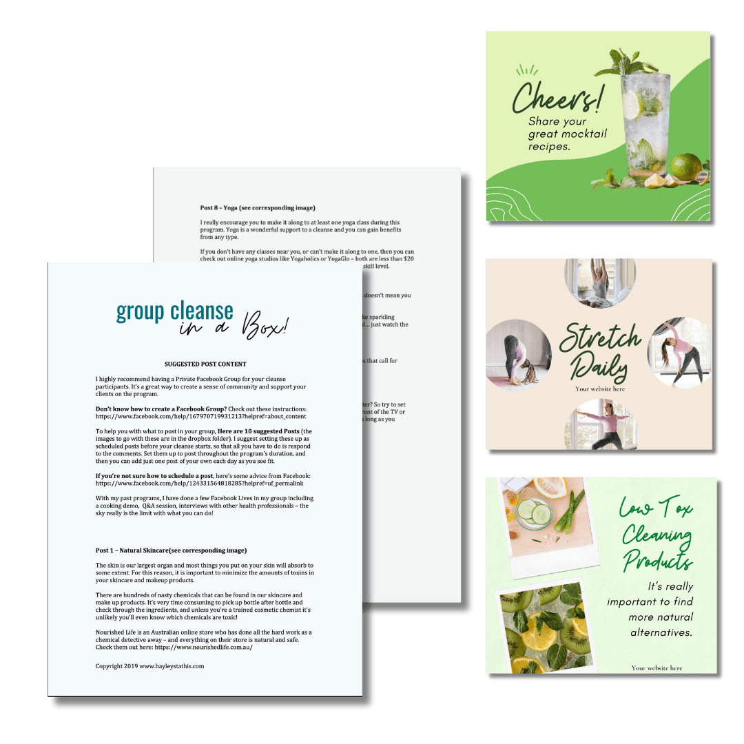 Done for You posts & captions to pop into your Cleanse’s Private Facebook group during the cleanse to keep participants engaged & motivated.