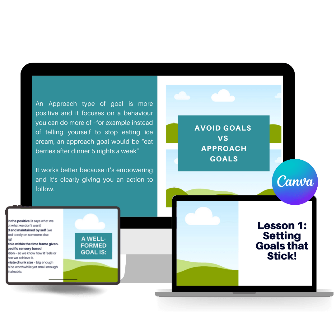 The Goal Setting Mini Course is a 100% written-for-you lesson that contains everything you need to teach your clients hoe to set goals that stick! You can use it inside your programs, send a recording to new 1:1 clients, or teach it live as a paid workshop or free lead magnet - it's up to you!