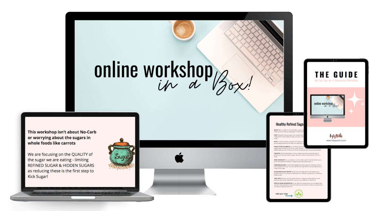 The Online Workshop in a Box is a 100% written-for-you Nutrition Workshop that contains everything you need to quickly create a workshop to attract new clients to your Health & Wellness Practice. A workshop positions you as the expert and quickly develops that 'know, like & trust' factor that potential clients need before they book in with you!