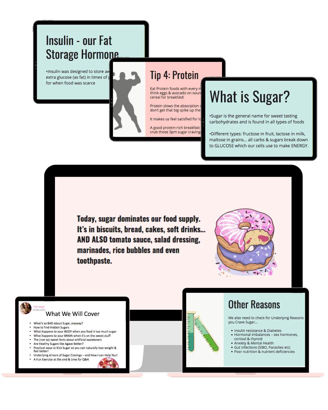 You will have immediate access to a stack of Canva Templates including: a Done for you Workshop Presentation on the universal nutrition topic "Kick Sugar", two Audience Handouts, Rock Your Workshop Guide, Social Media Posts & Captions, Training Video and more!