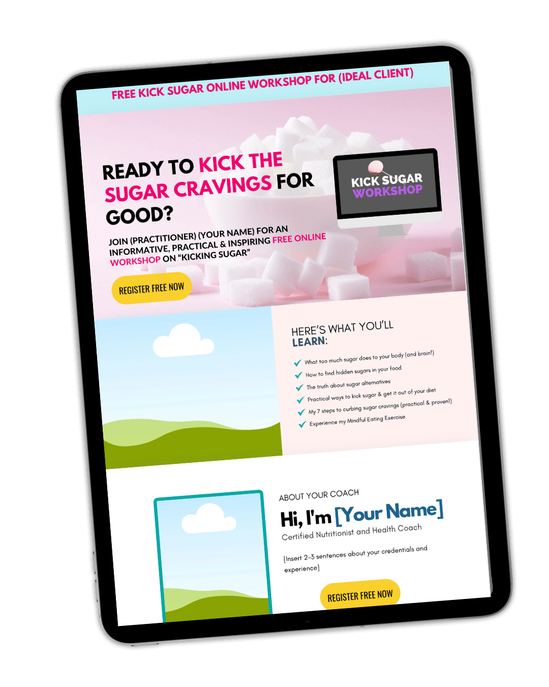 Use this gorgeous & expertly designed Canva Website Page Template as your Kick Sugar Registration Page, to collect emails.